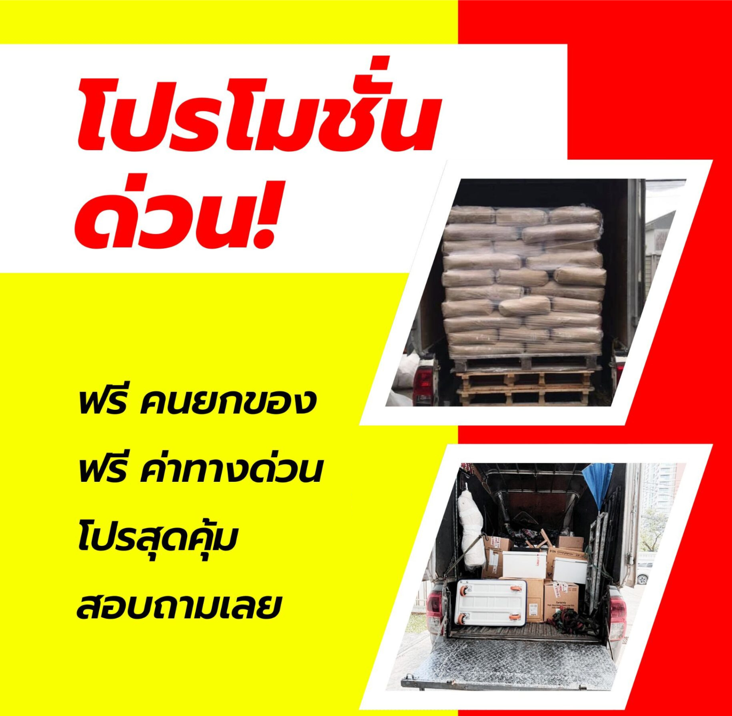 ### บริการพิเศษ– ฟรีคนช่วยยก ไม่ต้องกังวลเรื่องการยกของหนัก– ฟรีค่าประเมินราคา เพื่อความสบายใจในการวางแผนขนย้าย– ฟรีค่าทางด่วน ไม่มีค่าใช้จ่ายเพิ่มเติม– ส่งรวดเร็ว ทันใจ พร้อมต่อรองราคาได้ตามความต้องการ