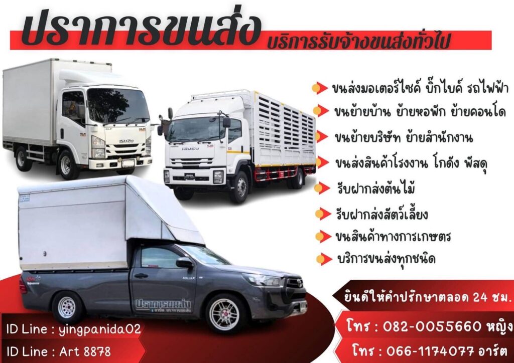 ### บริการเสริม– ฝากส่งมอเตอร์ไซค์และบิ๊กไบท์ข้ามจังหวัด– ขนย้ายสินค้าโรงงานทุกประเภท– ขนย้ายแคมป์ก่อสร้างทุกจังหวัด– ขนส่งสินค้าอุปโภค บริโภคทุกชนิด– ขนย้ายวัสดุก่อสร้าง– รับขนของไปทิ้ง– ขนย้ายสัตว์เลี้ยงอย่างปลอดภัย– ขนย้ายเครื่องจักรและอุปกรณ์หนัก– ขนสินค้าการเกษตร เช่น ปุ๋ยและดิน– ขนย้ายสำนักงานและบูทโรงงาน– ฝากส่งของชิ้นเดียว เช่น ตู้เย็น ทีวี เครื่องซักผ้า และอื่นๆ